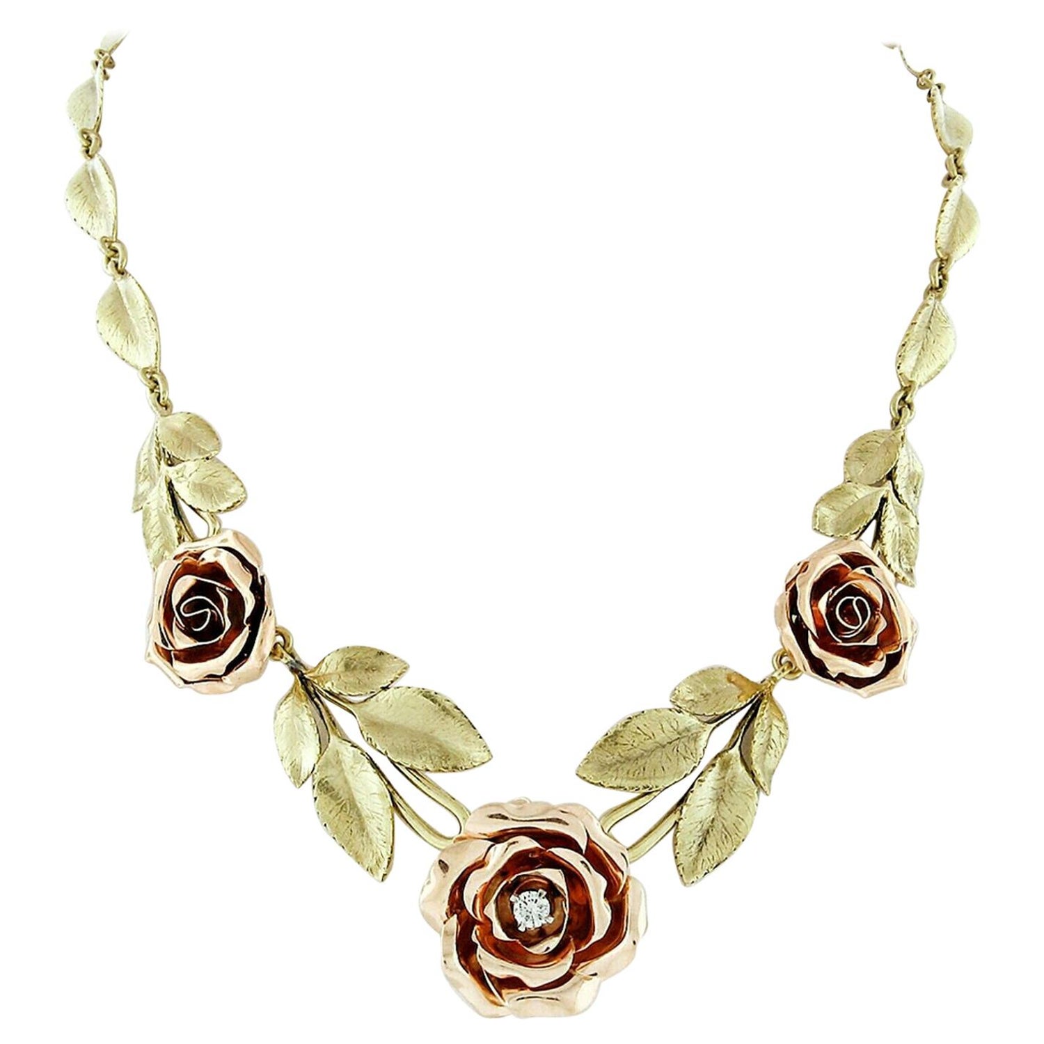 Vintage 14k Rose And Green Gold Rose Flower Diamond Leaves Statement Necklace At 1stdibs