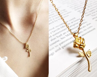 Dainty Gold Rose Necklace Gold Rose Pendant Stem Rose Flower Etsy